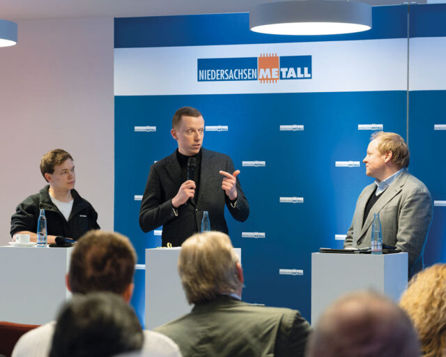 Diskussionsrunde: NiedersachsenMetall-Hauptgeschäftsführer Dr. Volker Schmidt (v.l.), Timon Dzinus, Adis Ahmetovic, Tilman Kuban, Dr. Gero Hocker und Moderator Andreas Kuhnt