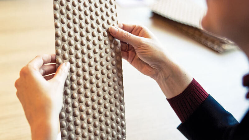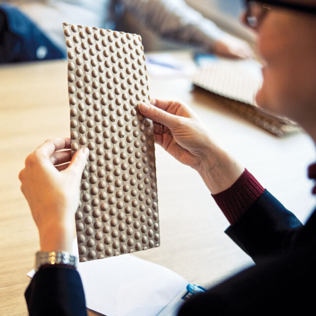 Prägen setzten dem Material Grenzen. »Für die Kuppelform unserer Bubbles ist das Papier extremen Beanspruchungen ausgesetzt«, sagt Widdel. Das beste Ergebnis erzielten sie mit Frischfaserpapier mit langen Fasern, wie es auch im Sackbereich für Zement oder Tierfutter verwendet wird. Es ist reißfest, belastbar und weiterhin gut recyclingfähig. Obwohl Widdel gar nicht aus dem Papier-, sondern aus dem Kunststoffbereich kommt, war für die drei Gründer immer klar, dass sie bei Papier als Basis für ihre Luftpolsterfolie bleiben wollen. »Das Problem bei Kunststoffen ist die Sortierung«, erklärt Widdel. Recycling funktioniere nur bei sortenreinen Materialien, alles andere müsse verbrannt werden. Papier hingegen habe einen entscheidenden Vorteil: »Egal welches Papier man nutzt, es besteht immer aus Zellulosefasern, und das Papierrecycling in Deutschland und Europa funktioniert sehr gut.«