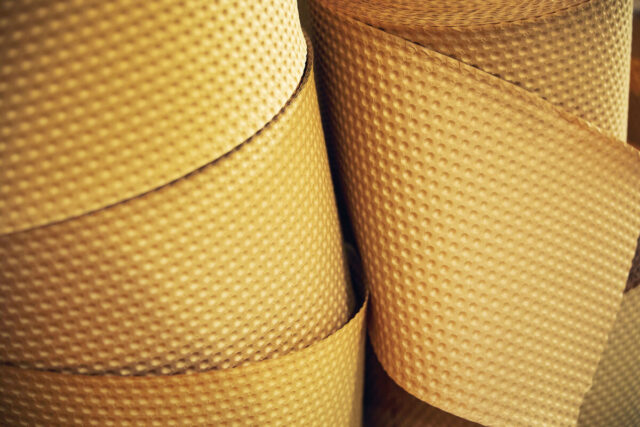 Papair bietet seine Luftpolsterfolie in zwei Ausprägungen an: einlagig und doppellagig. Bei der doppelten Variante kommt ein spezielles Verfahren zum Einsatz, um die beiden Bahnen miteinander zu verbinden, welches die Basis des Patents darstellt. Denn Papair verwendet keinen Klebstoff. »Unsere Produkte bestehen nur aus Zellulosefasern und Wasser«, erklärt Solf. Unter Hitze und Feuchtigkeit werden zwei Papierbahnen miteinander verbunden und ergeben ein stabiles, zweilagiges Polstermaterial, bei dem die ungeprägte Lage aus Recyclingpapier besteht. Daraus fertigt Papair zurzeit PapairWrap, die Luftpolsterfolie aus Papier auf Rolle sowie als konfektionierte Bögen und Beutel. Letztere müssen jedoch noch mit viel Handarbeit hergestellt werden. »Perspektivisch wollen wir diese Schritte direkt in die Anlage integrieren«, sagt Solf. Der nächste