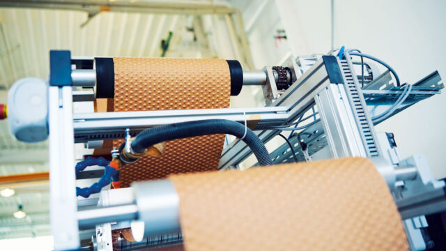 Die ersten Experimente fanden in Solfs WG-Küche statt. »Wir hatten uns im Internet ein Lochblech bestellt, das in den Ofen passte«, erzählt Widdel. Mit einer selbstgedruckten Walze und viel Kraft prägten sie Bubbles in feuchtes Papier. »Das Ergebnis sah schon ganz gut aus, also sind wir damit zu Papierherstellern und Wellpappbetrieben gegangen. Doch dort folgte die Ernüchterung. »Die Firmen sagten, das sei eine nette Idee, aber ohne ein Konzept für die technische Umsetzung könnten sie mit uns nicht ins Geschäft kommen«, erinnert sich Solf. Also suchten die drei Gründer sich ein Maschinenbauunternehmen, das mit ihnen gemeinsam eine Produktionsanlage baute, die die Bubbles stabil und in Serienfertigung in Papier prägen konnte. »Das hat natürlich gedauert, und so konnten wir die Pilotanlage erst 2023 in Betrieb nehmen«, sagt Solf.