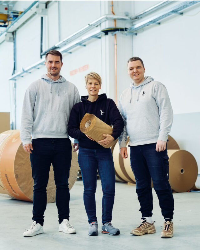 Es knallt nicht so schön, wenn man die kleinen Bläschen zerdrückt. Aber dafür hat man ein besseres Gefühl, etwas darin einzuwickeln: Luftpolsterfolie aus Papier. Noch ist sie ein Nischenprodukt im Bereich des Verpackungsmaterials, doch das junge Unternehmen Papair aus Hannover arbeitet hart daran, das zu ändern. Im vergangenen Herbst ist es dem Team um Fabian Solf, Steven Widdel und Christopher Feist gelungen, einen echten Branchenriesen für ihr Produkt zu begeistern. Seit ca. einem Jahr verlassen täglich rund 9.000 Produkte aus dem ROSSMANN-Sortiment in Verpackungsmaterial von Papair das E-Commerce Lager in Hannover/Großburgwedel. Ein Meilenstein, den sich die Gründer vor sechs Jahren noch nicht hätten träumen lassen, als sie in der WG-Küche standen und mit einer selbstgedruckten Walze und den im Backofen vorgeheizten Lochblechen versuchten, Luftkissen in Papier zu prägen.